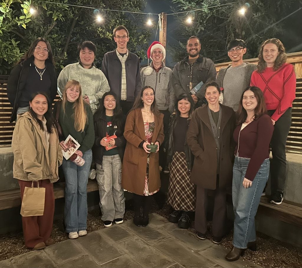End-of-the-year holiday party 2025. Front row, left to right: B’Elanna, Kelly, Tiffany, Olivia, Xylina, Susannah, Aly. Back row, left to rght: Perla, Shiyu, Alexander, Johan, Eduardo, Eric, Mira.
